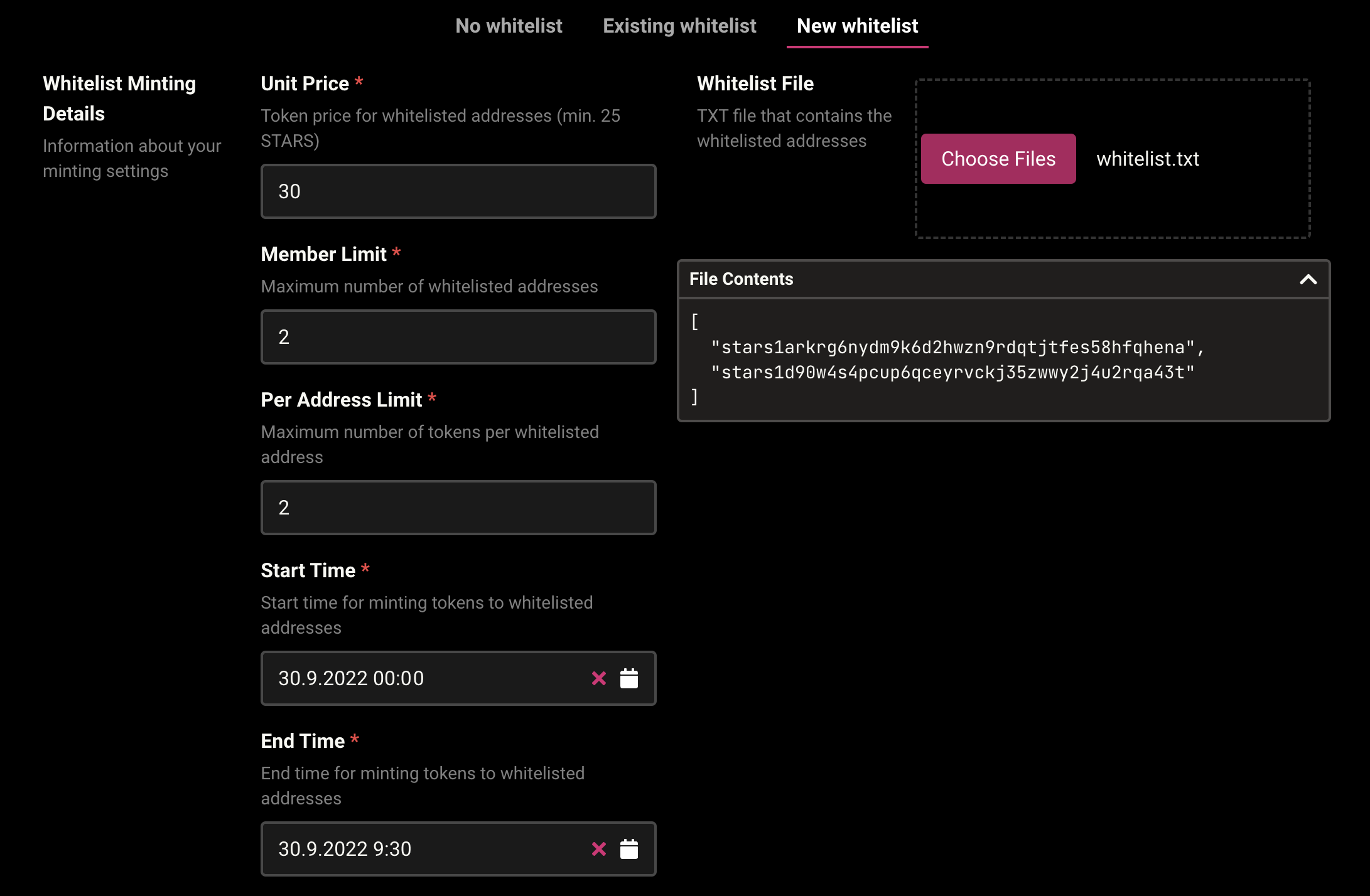 * **Start Time:** Start of minting time for whitelisted addresses